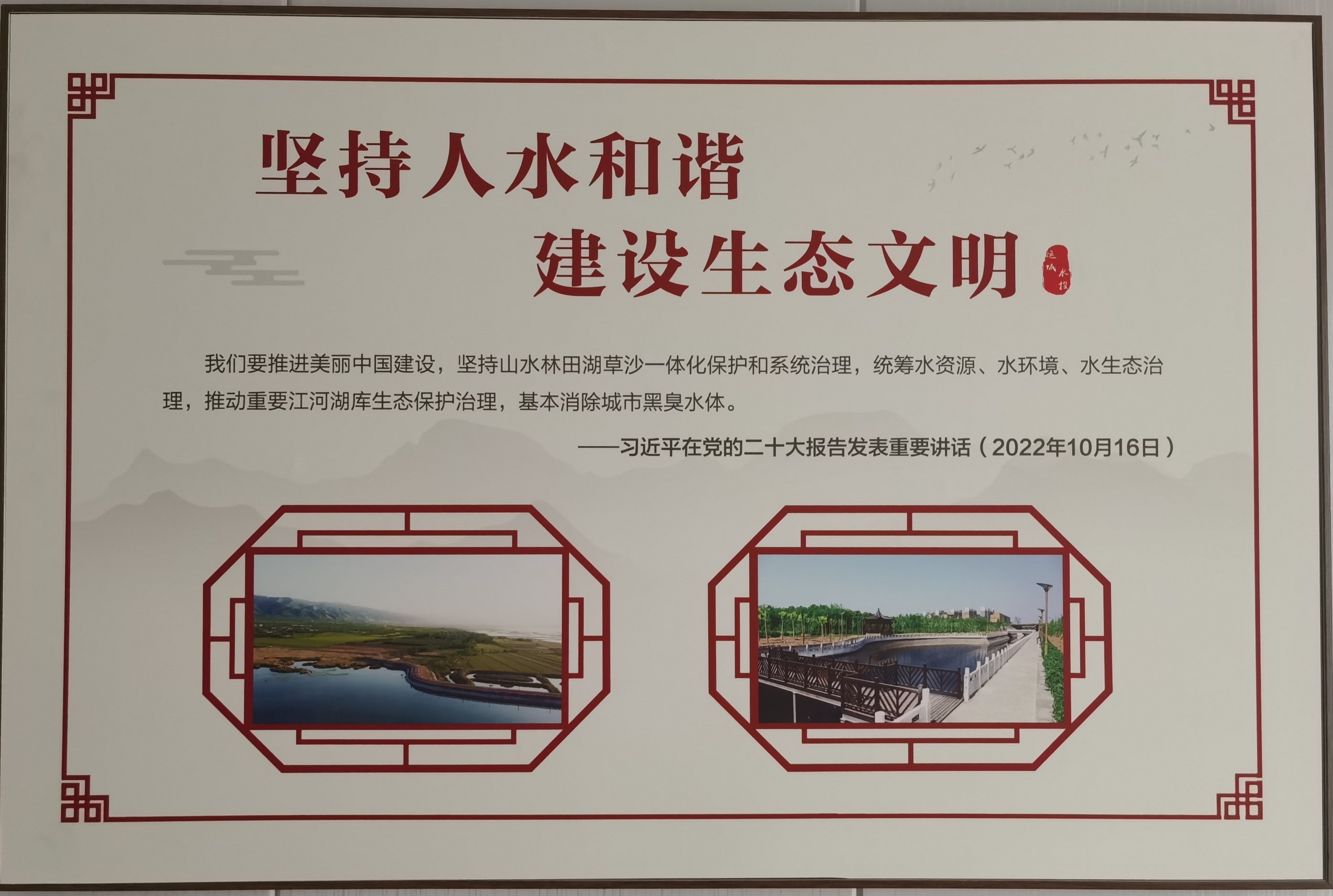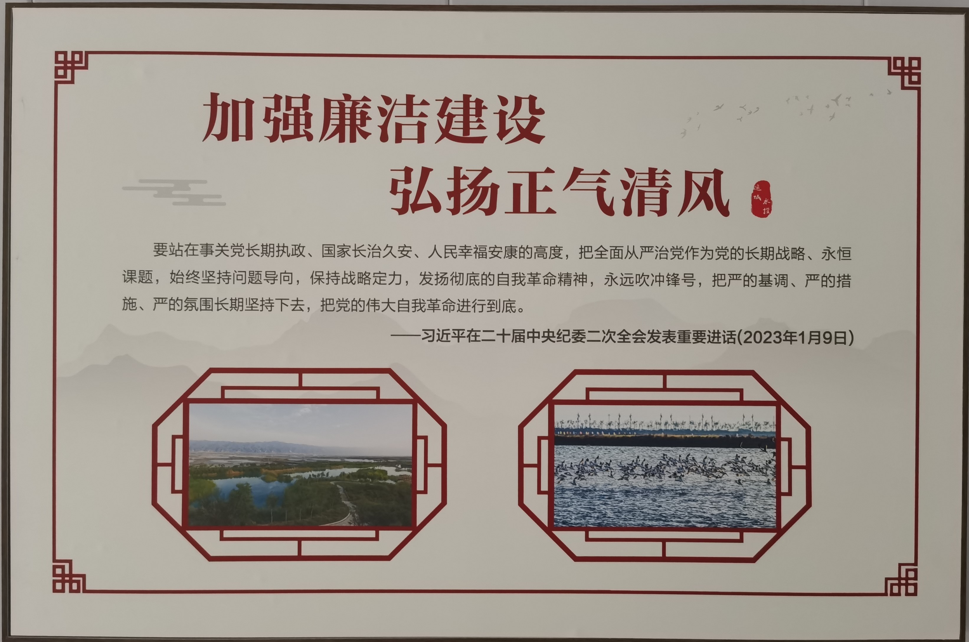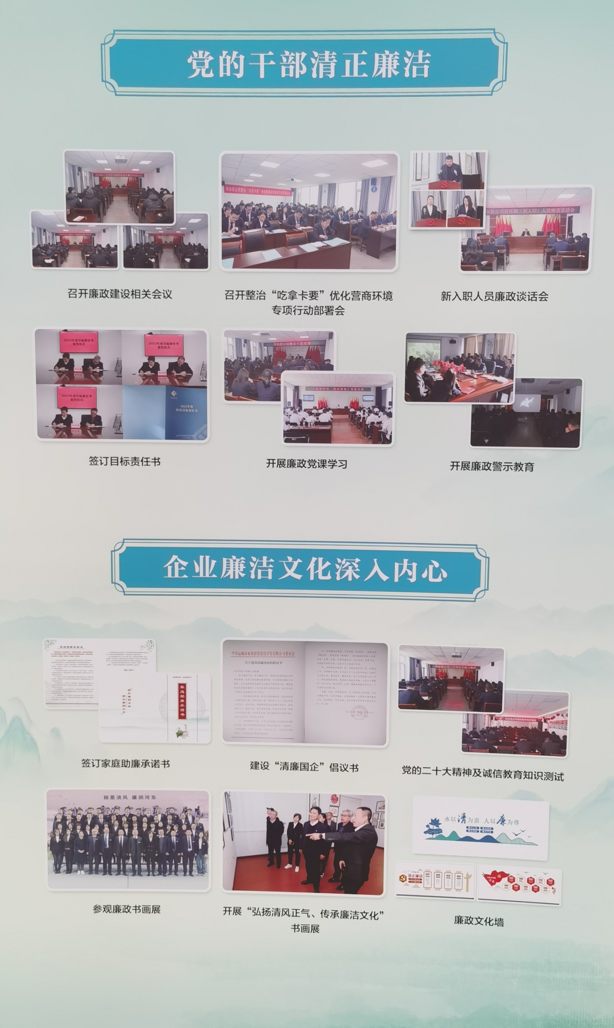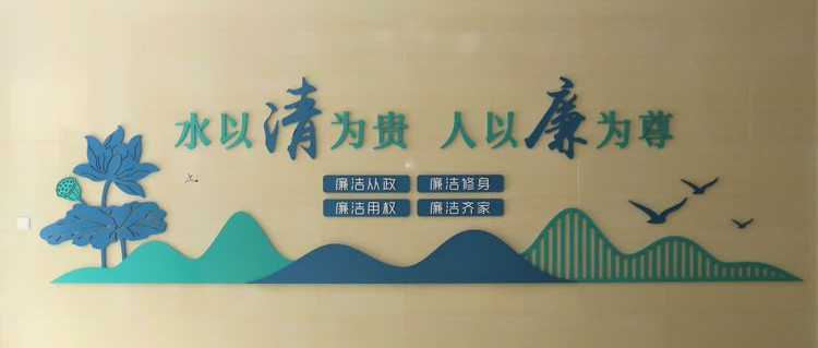 走進(jìn)公司辦公樓,映入眼前的一幅以“水以清為貴 人以廉為尊”為主題的廉政文化墻,讓人入眼入心,敬廉崇尚的山水風(fēng),簡約凝練的文字,與構(gòu)建“清廉之風(fēng)”潤“人水和諧”的良好生態(tài)發(fā)展相融合。同時(shí),通過廉政書畫室建設(shè)、清廉習(xí)語版面、廉政形象墻、水生態(tài)治理修復(fù)成效版面等多角度多層次厚植了廉政理念,夯實(shí)了廉政根基,營造了學(xué)廉敬廉的濃厚氛圍。
