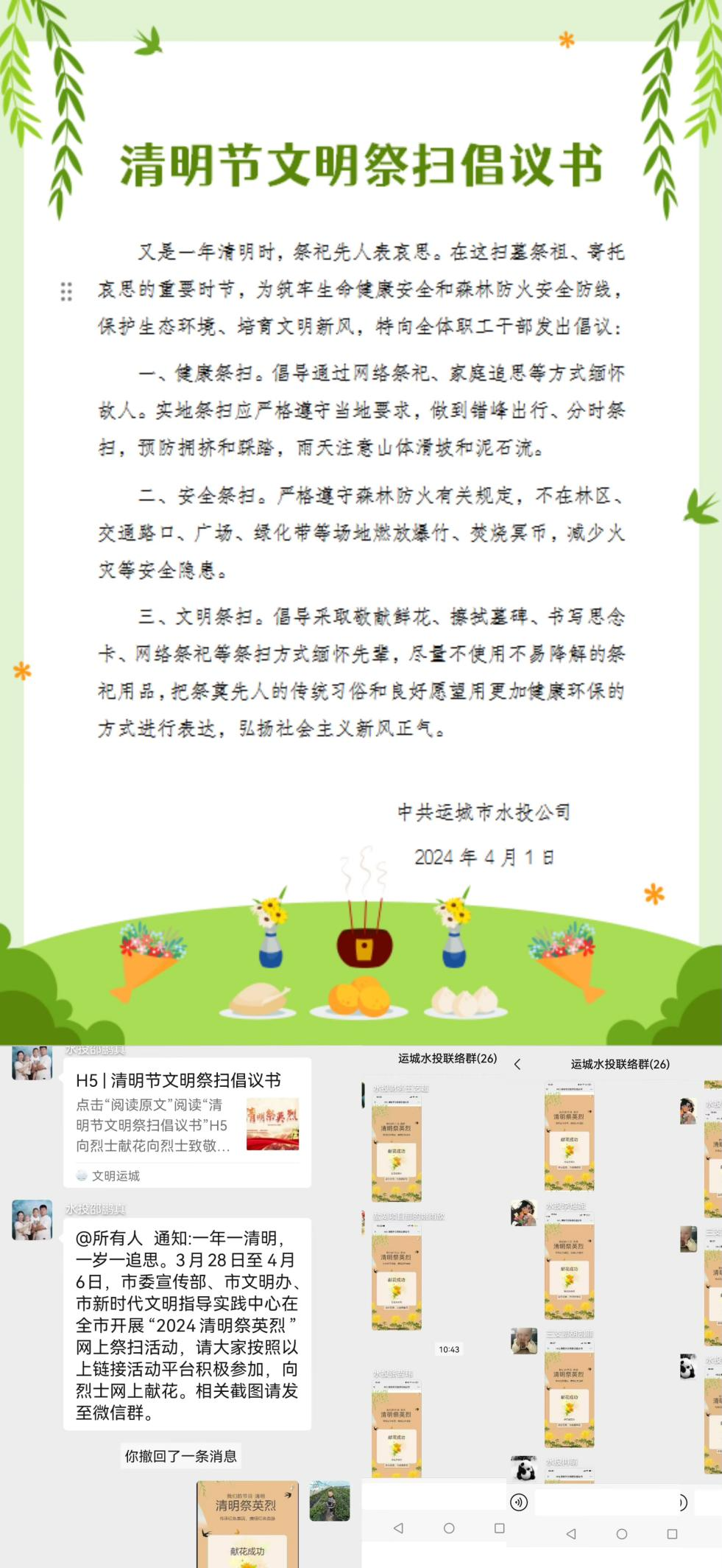 山河肅穆,英靈長眠,清明節(jié)祭掃革命先烈是中華民族的光榮傳統(tǒng)。為弘揚中華民族優(yōu)良傳統(tǒng),培育文明新風(fēng),按照市文明委《關(guān)于組織開展“我們的節(jié)日”清明祭英烈主題活動的通知》要求,4月2日,公司開展“網(wǎng)上祭英烈”主題活動。