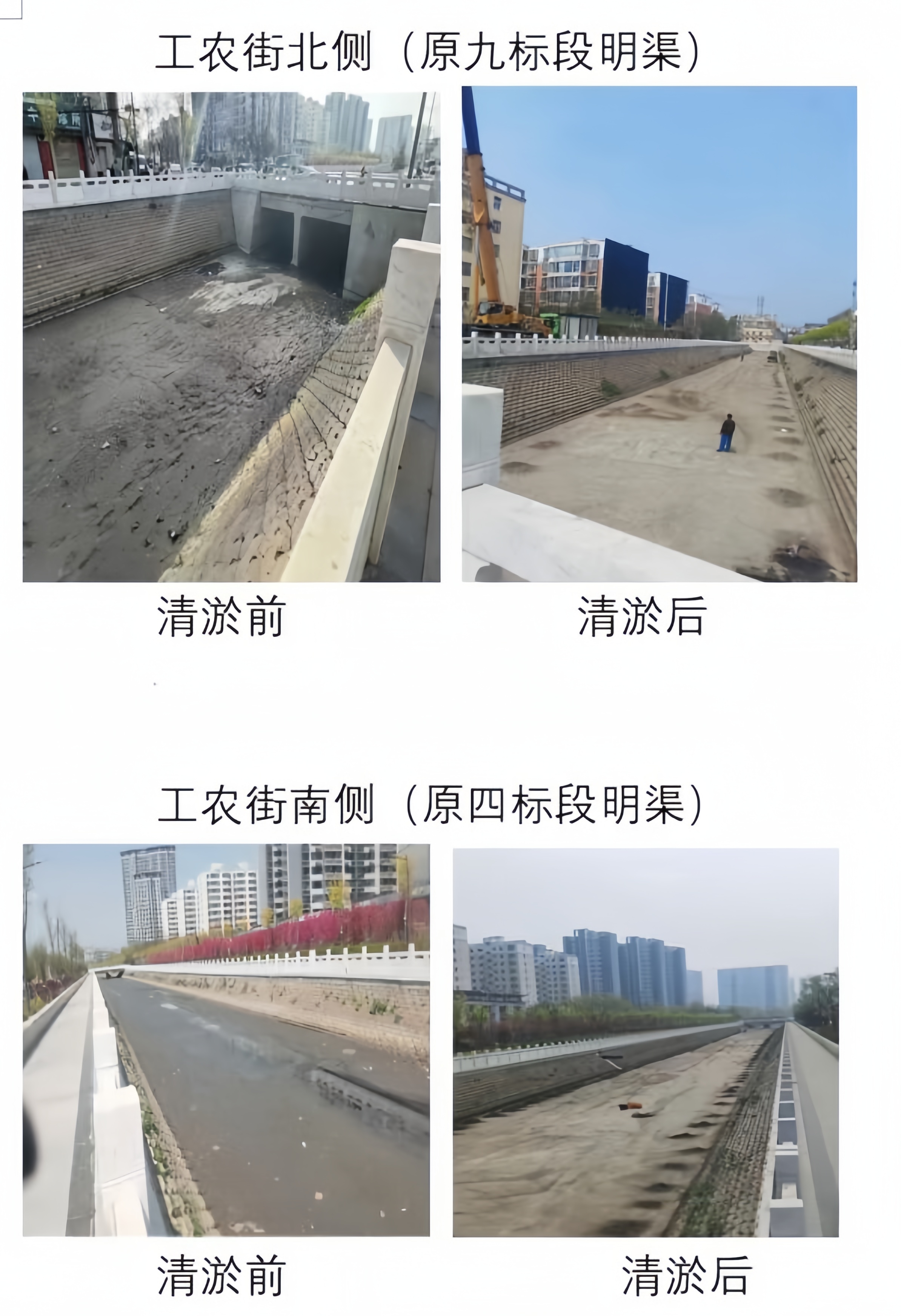 由于時間緊,任務(wù)重,為加快清淤進(jìn)度,確保施工安全,結(jié)合干河實際情況,采用人工和機(jī)械相結(jié)合的方式進(jìn)行,共清理2110m渠道。清理后河道變深、河水變清,周邊環(huán)境得到明顯改善。
